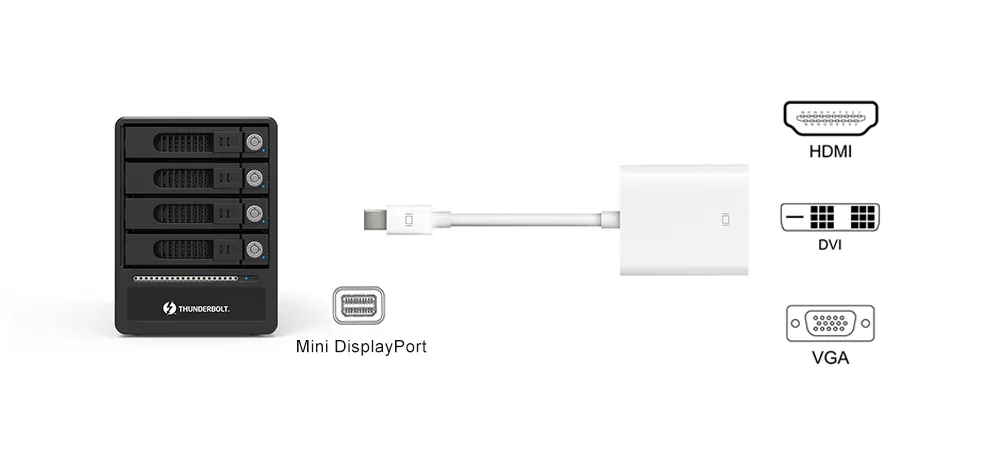 All our Thunderbolt 3 products also support a Mini DisplayPort which gives you a very easy way to connect to your display device. This Mini DisplayPort is fully complaint to all the existing DVI, HDMI, and VGA display devices thru an adapter.
