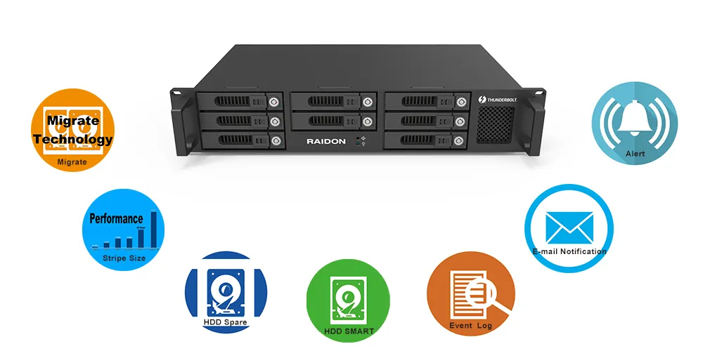 | Package Accessories | * GR8680-TB3 x 1 ( with removable drive tray enclosed x 8 ) * Thunderbolt Cable x1 * Power Cord x1 * Accessory Kit * Quick Installation Guide x1 |