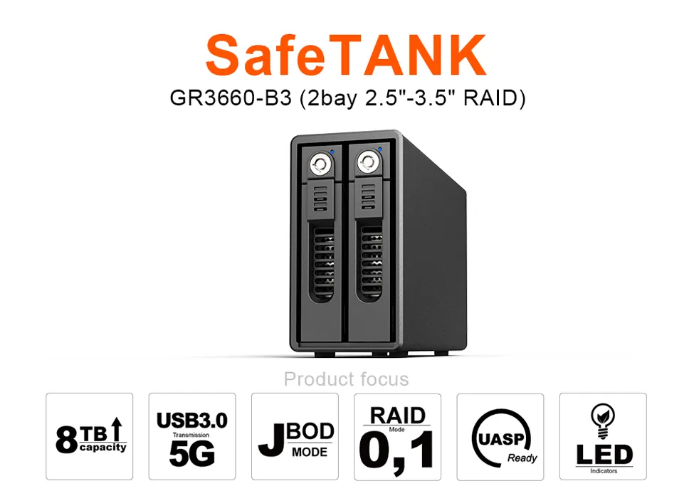 GR3660-B3 is a full-featured simple and easy dual bay storage device, along with RAID 0 (Striping), RAID 1 (Mirroring), and JBOD three application modes, with Super Speed USB3.0 transmission interface, not only with fast transmission performance but also easily content data safety with 16TB large storage capacity or information exchange requirement.