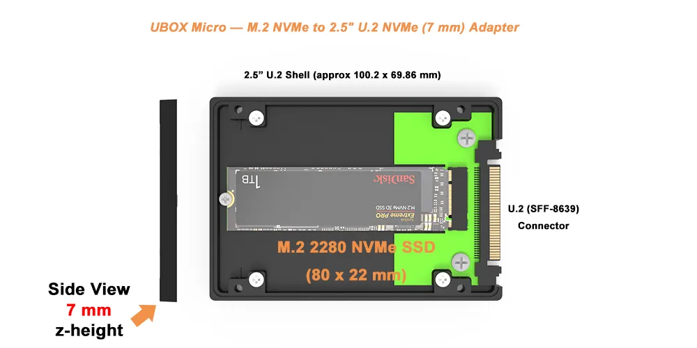 UBOX Micro — M.2 NVMe to 2.5" U.2 NVMe (7 mm) Adapter