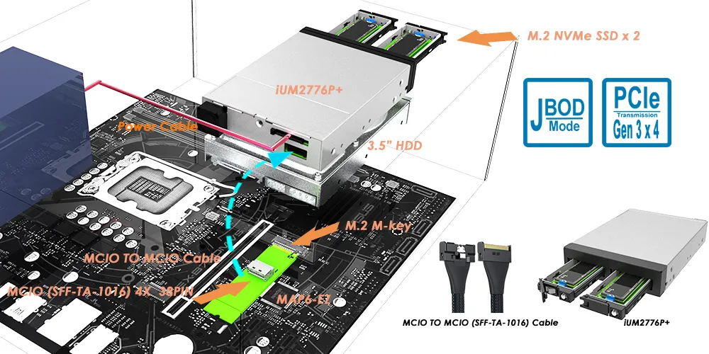 The iUM2776P+ is a professional-grade 3.5-inch storage module designed to house two M.2 NVMe SSDs. Using an integrated PCIe Gen3 Switch and an MCIO (SFF-TA-1016) interface, this module supports PCIe Gen3 x4 (up to ~32 Gbps aggregate / ~3.94 GB/s theoretical payload, per direction) and allocates Gen3 x2 per SSD (up to ~16 Gbps / ~1.97 GB/s theoretical per SSD). Its rugged, all-metal construction and tool-free maintenance make it the ideal choice for high-density computing environments that demand speed, scalability, and zero downtime.