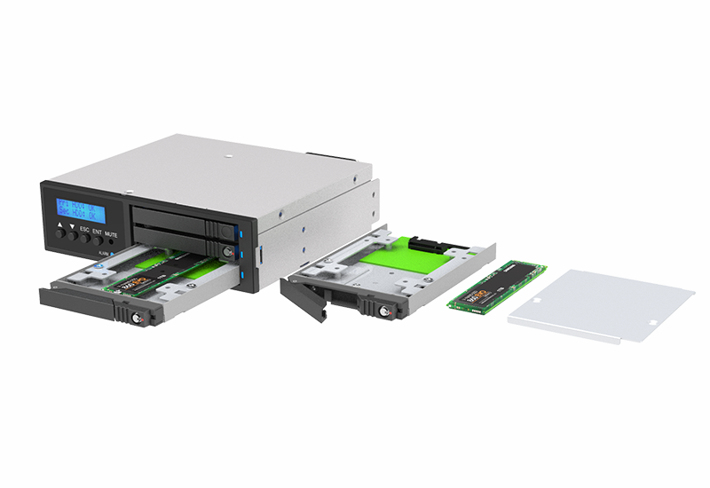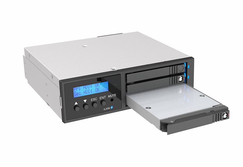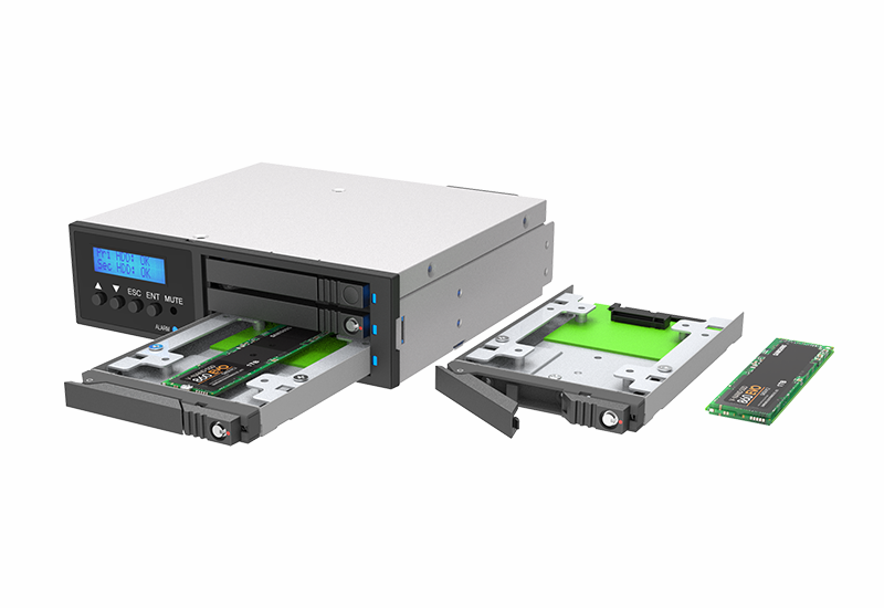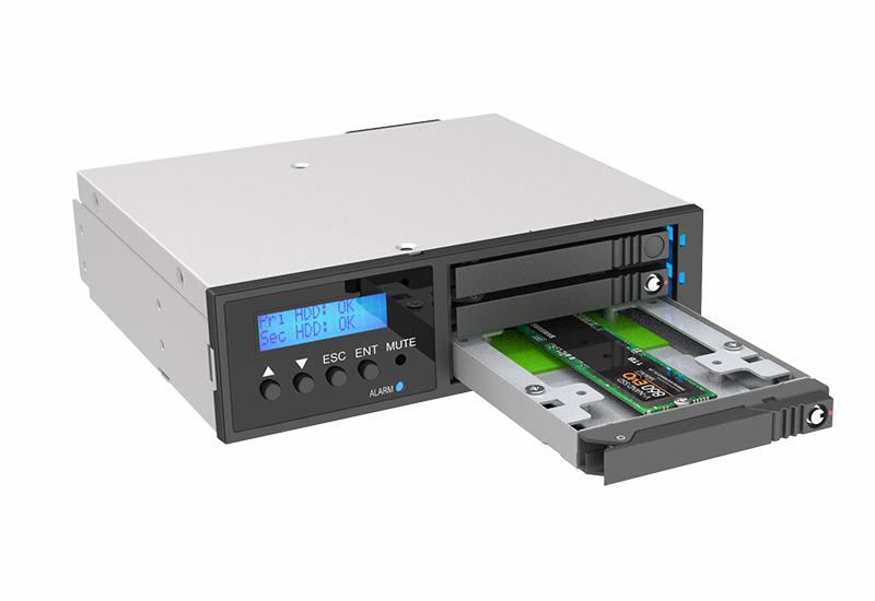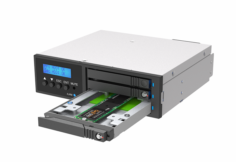 The disk array of iR8023 consists of two M.2 SATA SSDs (RAID 0/1), and a M.2 SATA SSD Converter, iR8023 has 2 SATA host interfaces for diversified purposes. The iR8023 is a dual function storage device, offering data security and removable storage for on the go data transport.