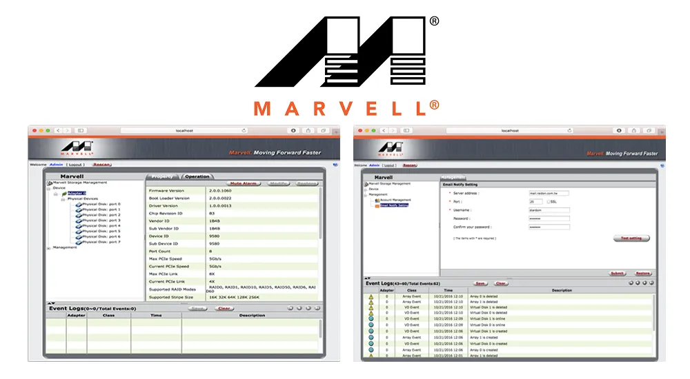 The Marvel MSU Utility could help monitoring the RAID status while your GR8670-TB3 is working, and alert you thru beeping sound from a loud buzzer, and sending you a warning message thru e-mail system. MSU also records all the product status in detailed and helps testing your HDD quality thru its built-in S.M.A.R.T. testing software for you.