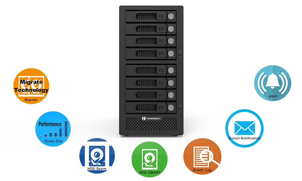 | Package Accessories | * GR8670-TB3 x 1 ( with removable drive tray enclosed x 8 ) * Thunderbolt Cable x1 * Power Cord x1 * Accessory Kit * Quick Installation Guide x1 |