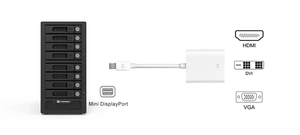 All our Thunderbolt 3 products also support a Mini DisplayPort which gives you a very easy way to connect to your display device. This Mini DisplayPort is fully complaint to all the existing DVI, HDMI, and VGA display devices thru an adapter.
