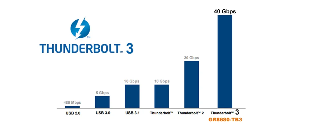 GR8680-TB3 supports Thunderbolt 3 (TB3) interface for an extreme high data transfer speed. And both of the two TB3 ports are equipped with up to 40Gb/s data transfer rate which is 4 times faster than USB 3.1 Gen 2 (USB 3.1) and 2 times than Thunderbolt 2 interface.