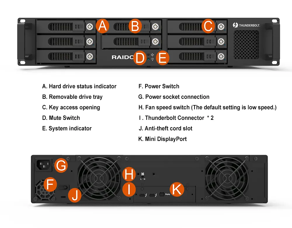 | Package Accessories | * GR8680-TB3 x 1 ( with removable drive tray enclosed x 8 ) * Thunderbolt Cable x1 * Power Cord x1 * Accessory Kit * Quick Installation Guide x1 |