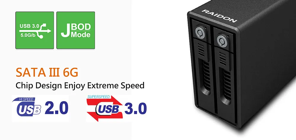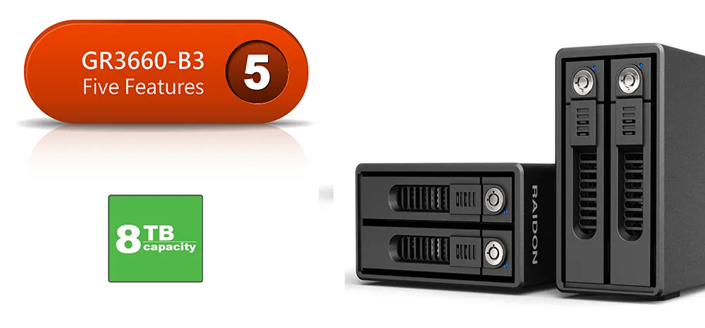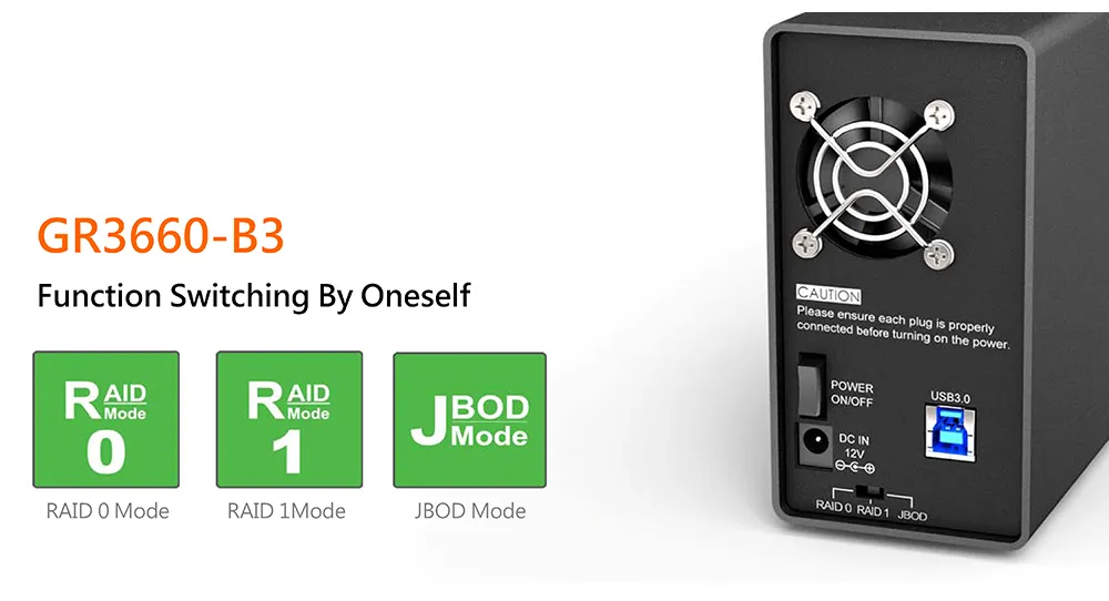 GR3660-B3 has three configuration modes built-in: RAID 1 (Safe Mode), RAID 0 (Speed Mode), and JBOD (Two Independent Volumes) for you to choose according to your needs.