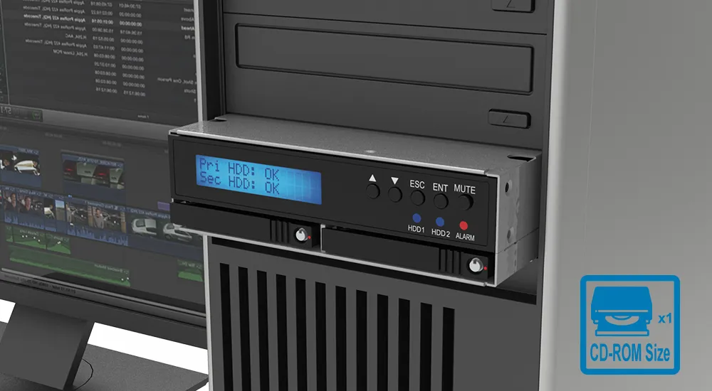 The iR2026 is an industrial-grade RAID solution built for high performance in space-constrained environments. Designed for standard 5.25-inch drive bays, it converts one bay into a dual-drive RAID array supporting two 2.5” SATA III SSDs or HDDs.