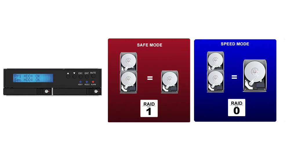 Selectable RAID 0 for high-speed striping or RAID 1 for automated mirroring and data protection.